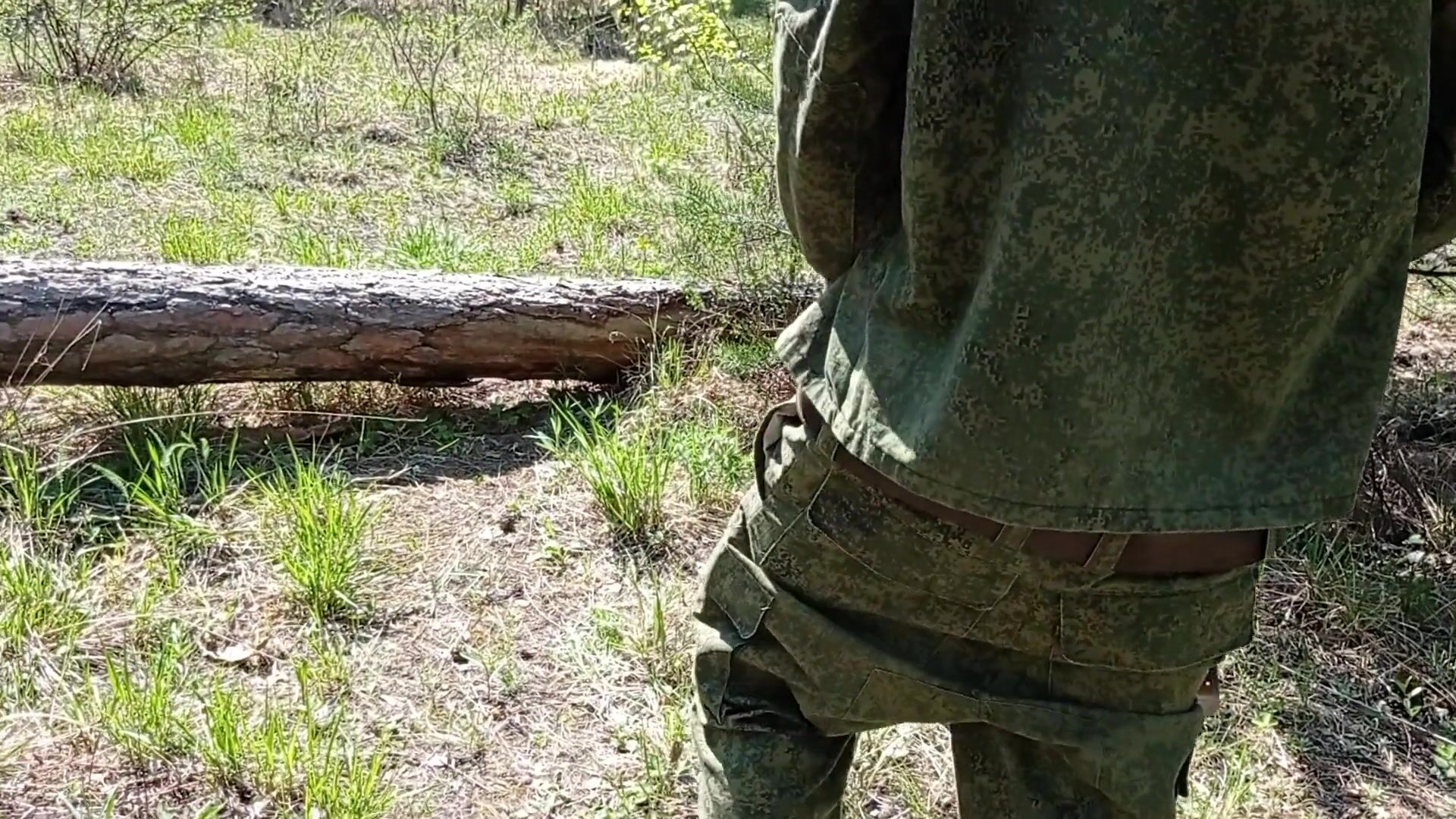 Youthful mind-blowing soldier faps off in the forest