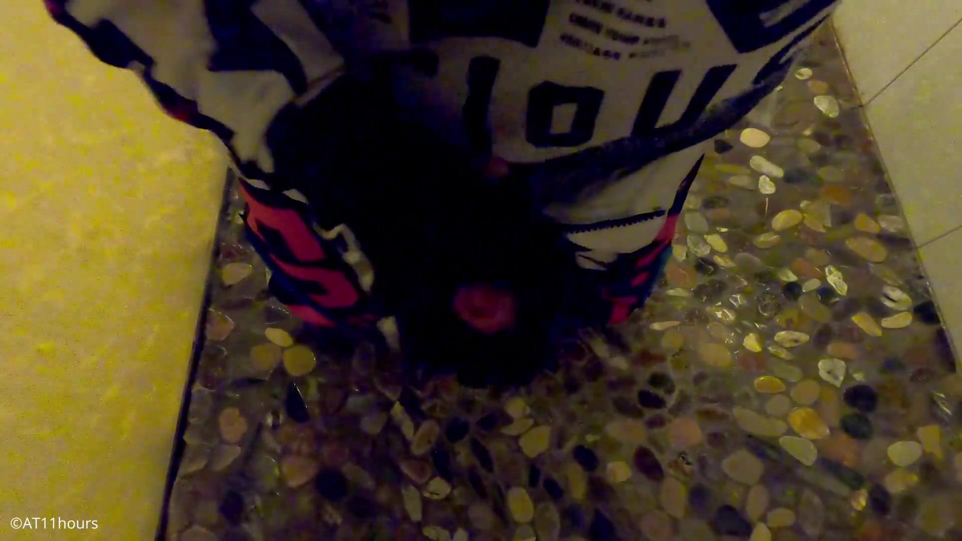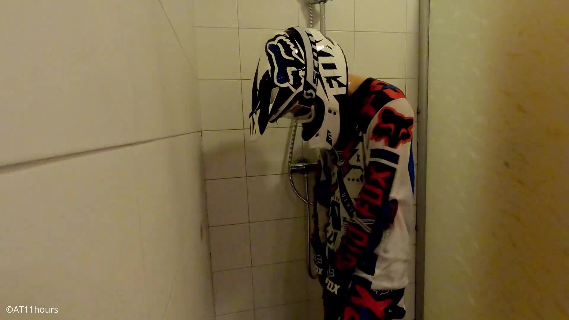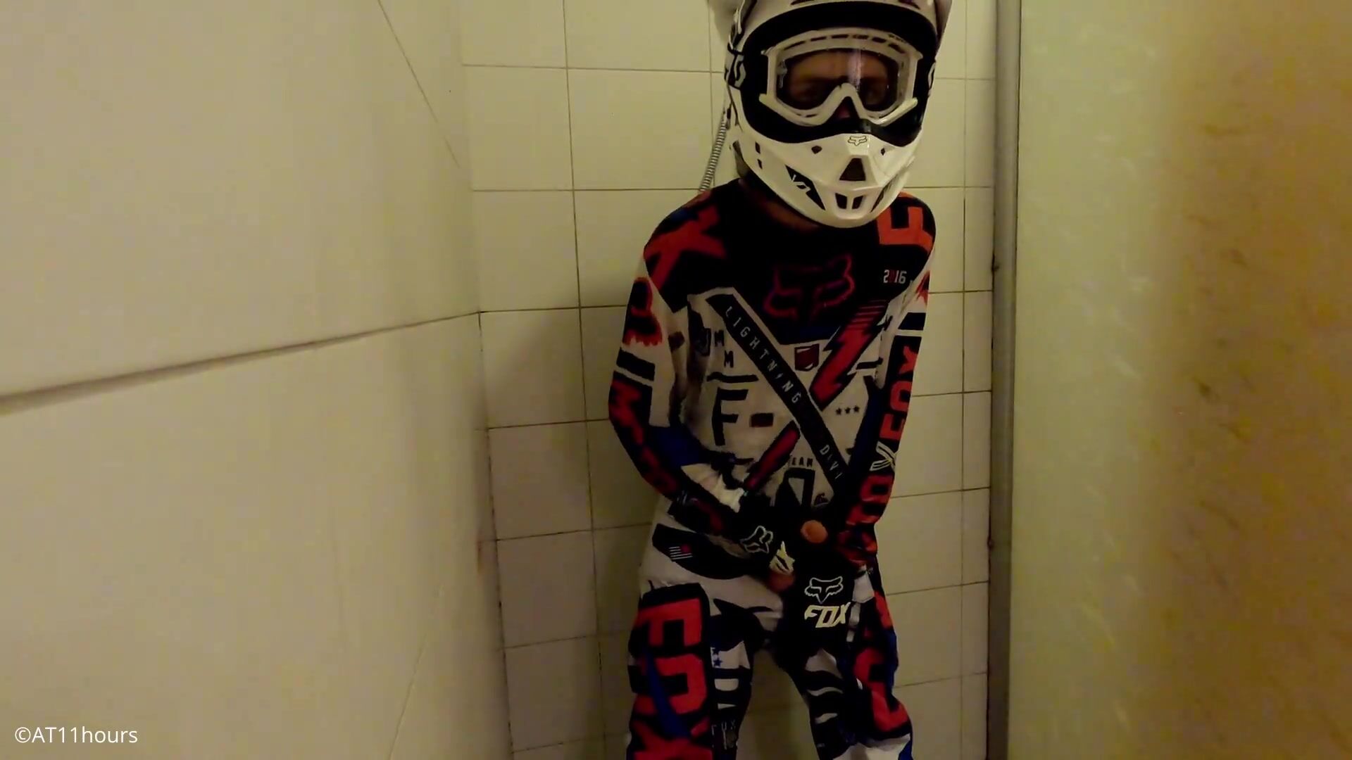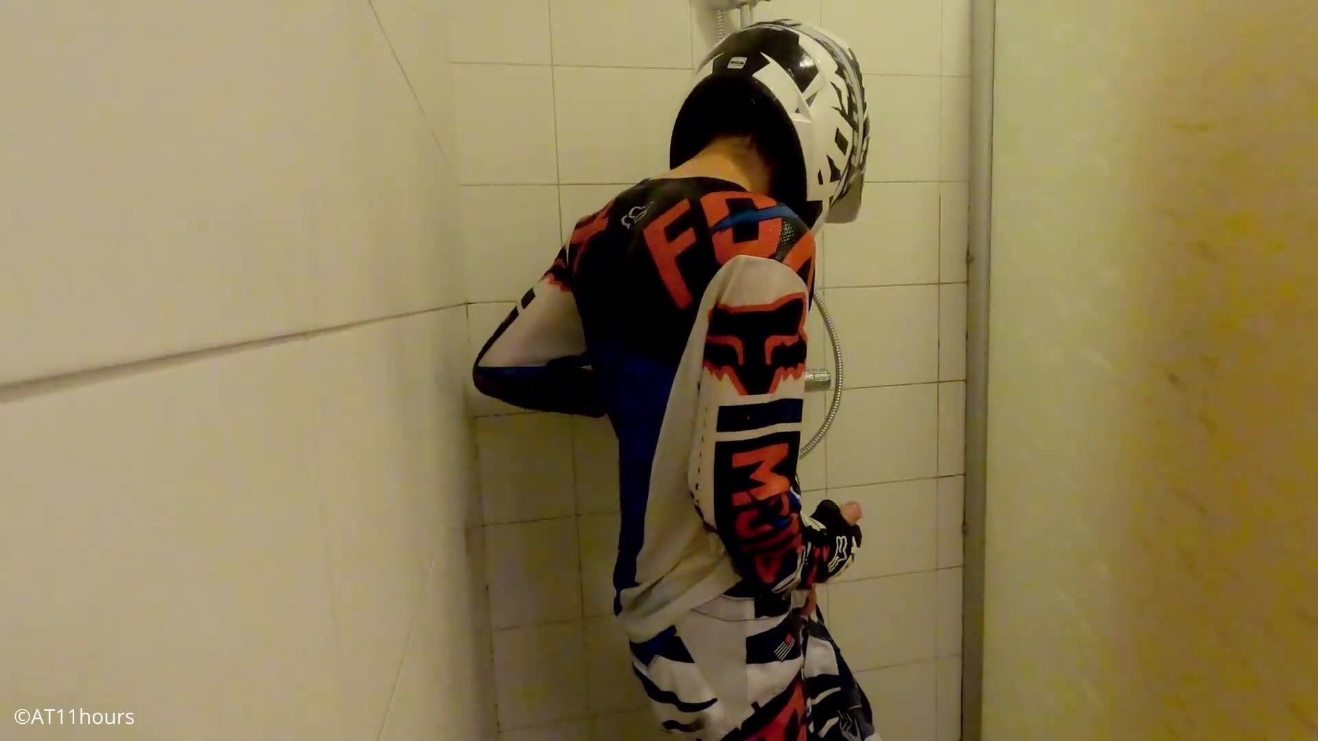 college-aged years Senior man take a bathroom in MX gear and jack off