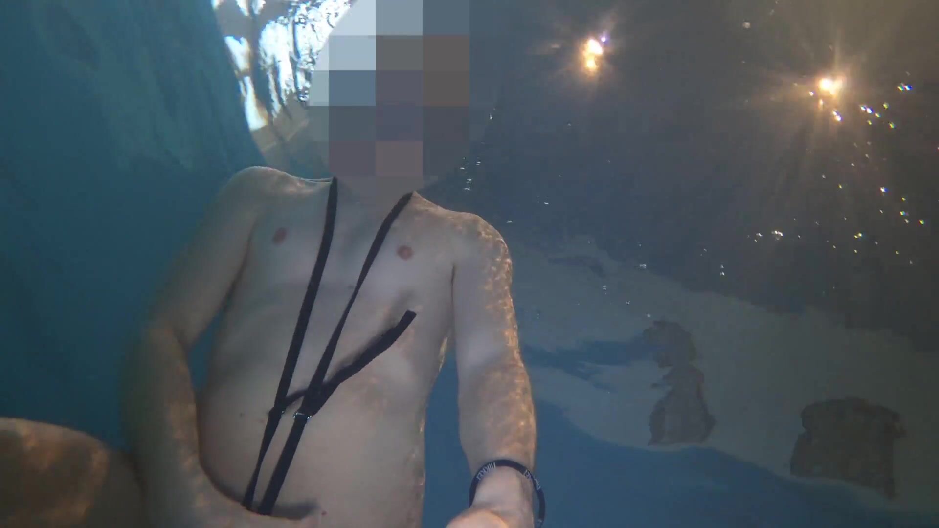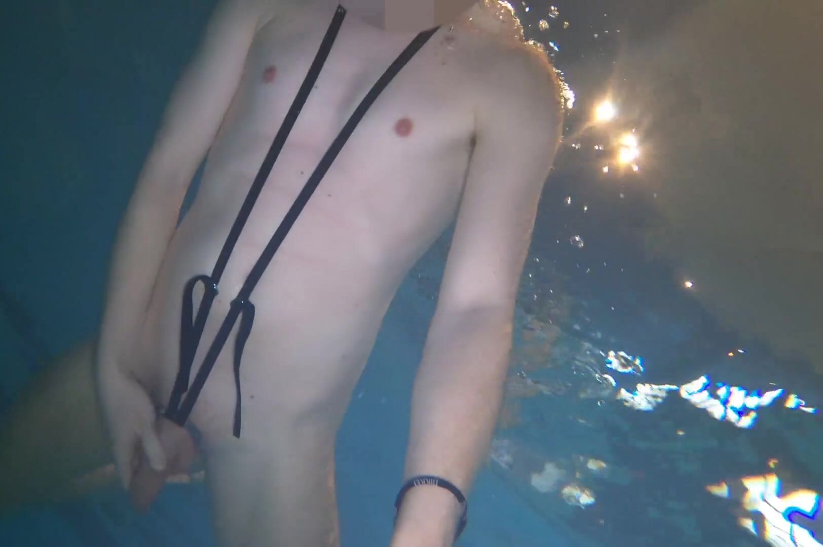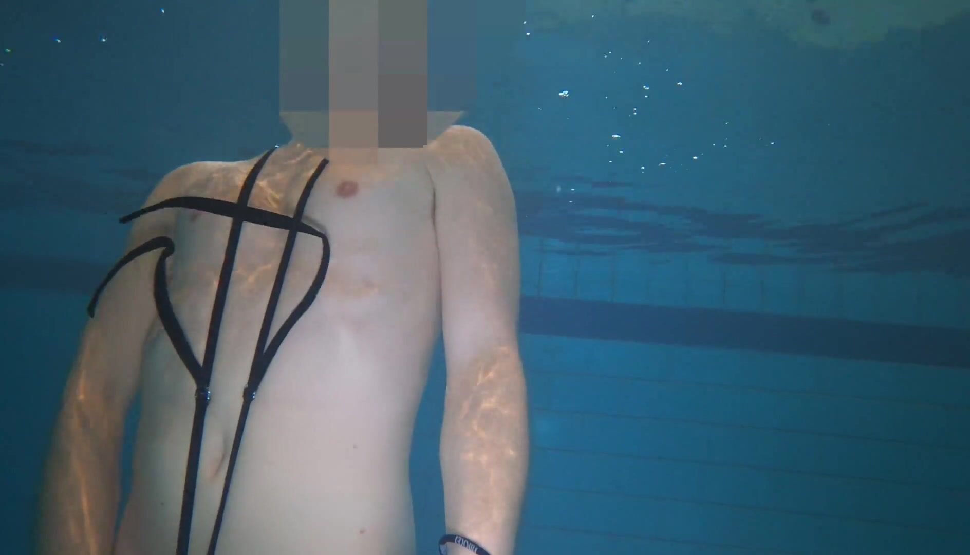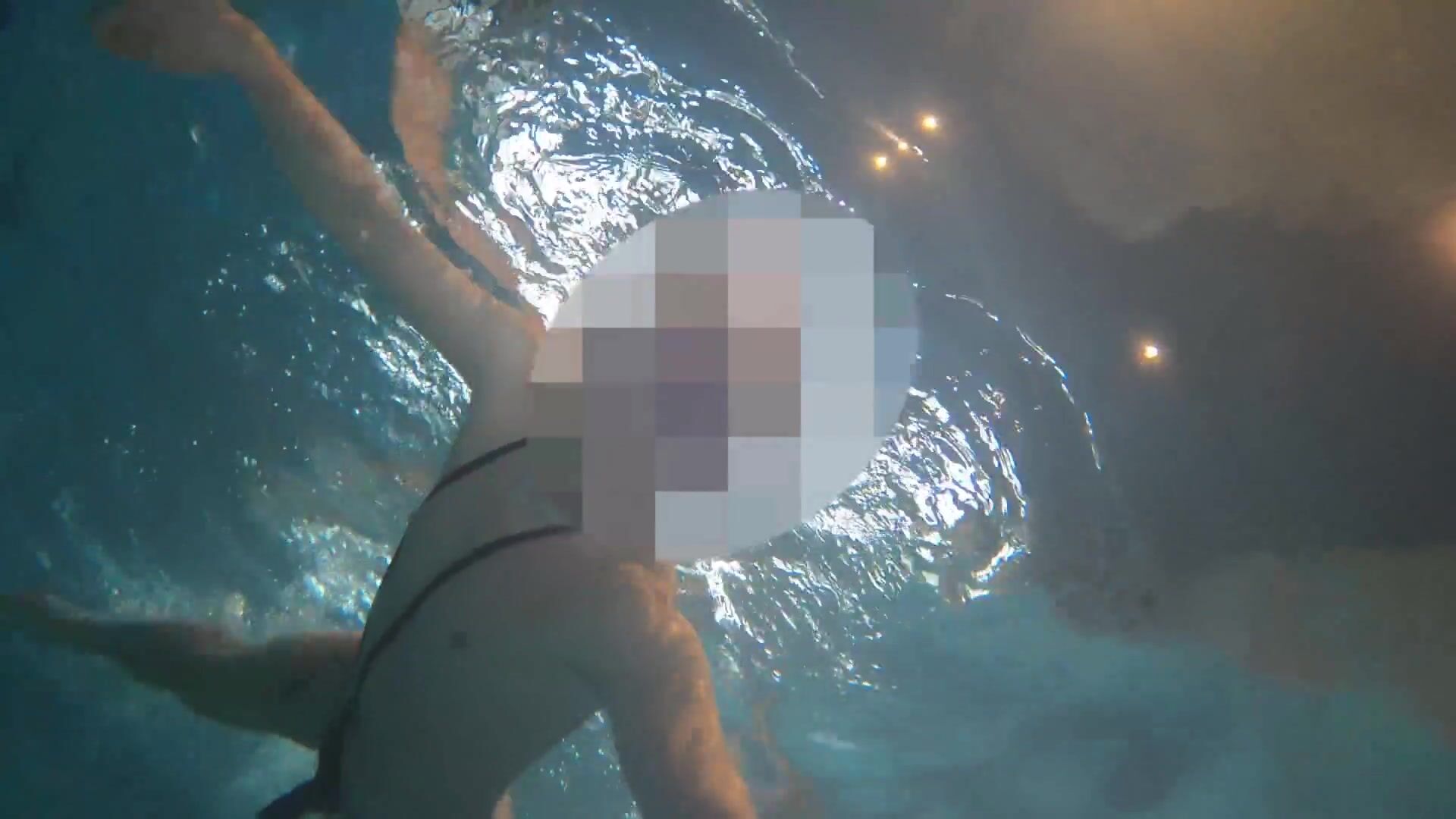 Nude swim and jizz with metal cockring and ass-plug