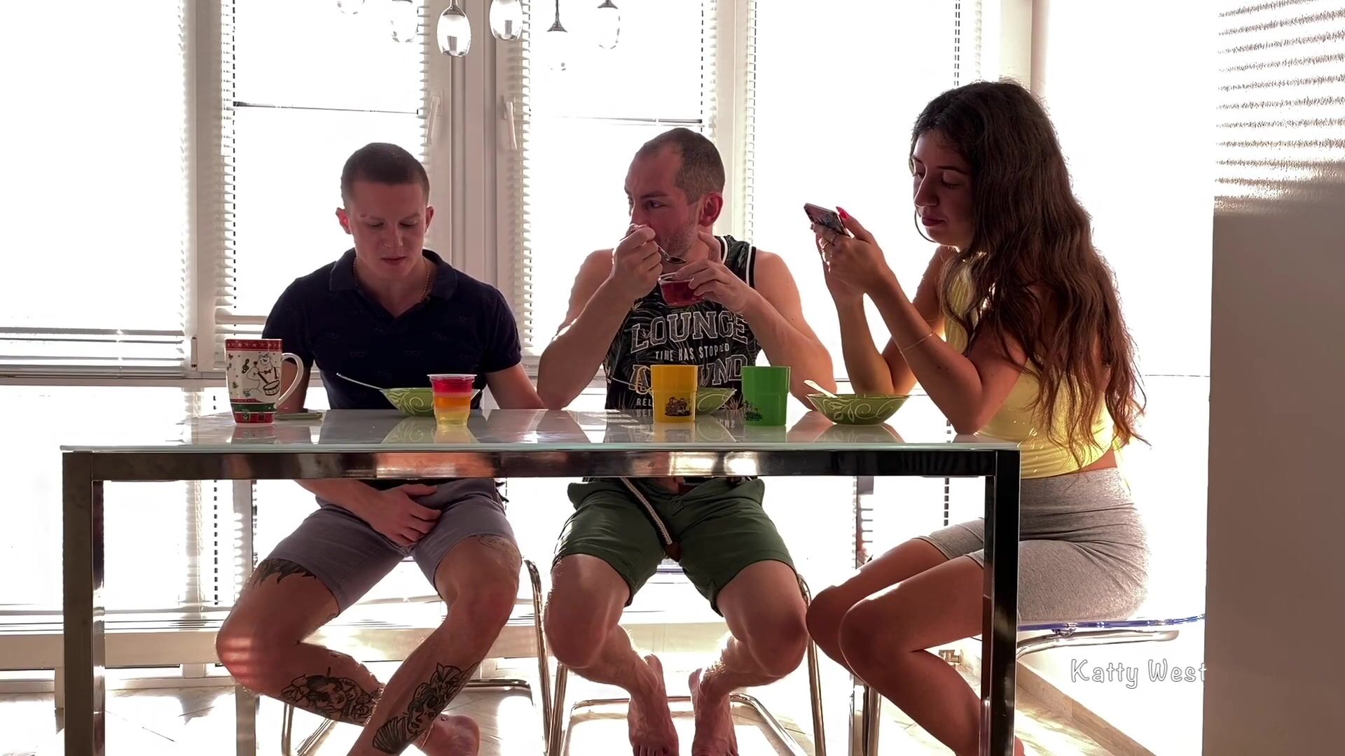 Deepthroated his mate pinkish cigar under the table until his wife watches