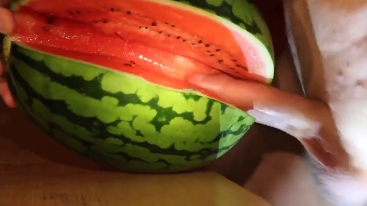 eating and playing with cum after fucking a melon and cumming into a condom